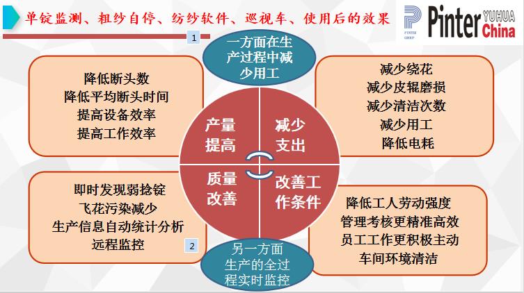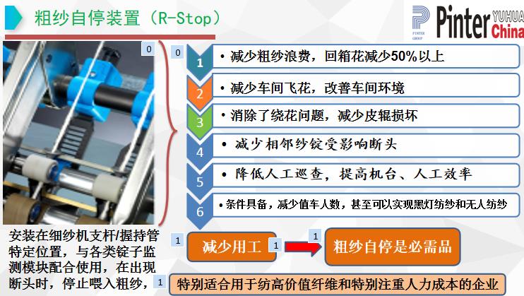 降低用工成本:监测到断头可即时打断粗纱,停止喂入,减少粗纱浪费。由于即时停止粗纱喂入,减少回花,废棉明显降低。降低胶辊、皮圈和罗拉的维护:粗纱自停装置及时停止粗纱喂入,避免了缠绕,降低对胶辊、皮圈、罗拉的损害。减少挡车工及保全工,降低用工成本。